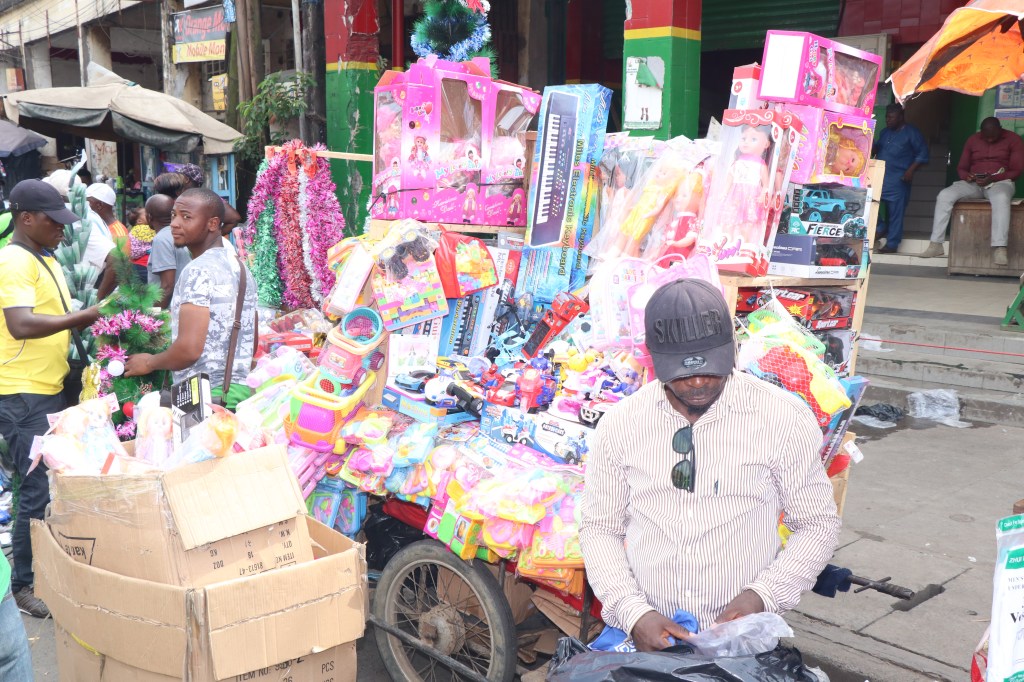 The items on sale on the city’s markets are telling that Christmas is around the corner, the affluence of people in most markets is a clear indication that the festive period is here. While in most markets, one could find toys of all kids and of all ages, some of the toys found in Marche Chinois in Douala include , cars, games of all sorts, airplanes, dolls, guitars, watches, balloons, pianos, tambourine, and a lot more. Christmas tree is very much present with it lights and other decorations readily available on sale. Shoes, dresses, and others are also available. Most hawkers and vendors have abandoned their shops within the market and have chop up more than half the space of the road. The atmosphere is lighted and most toys are singing Christmas carols