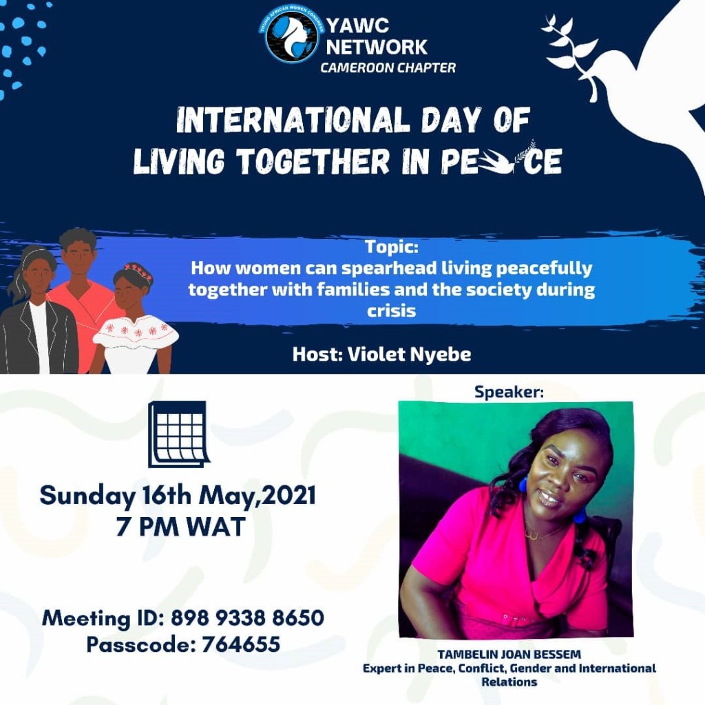 As part of the celebration marking the international Day of living together in peace, the Cameroon Chapter of the Young African Women Congress -YAWC Network organized a virtual seminar on the theme “How women can spearhead living peacefully together with families and societies during crisis”. The webinar on Sunday May 16 brought together over 15 participants from within and without Cameroon.