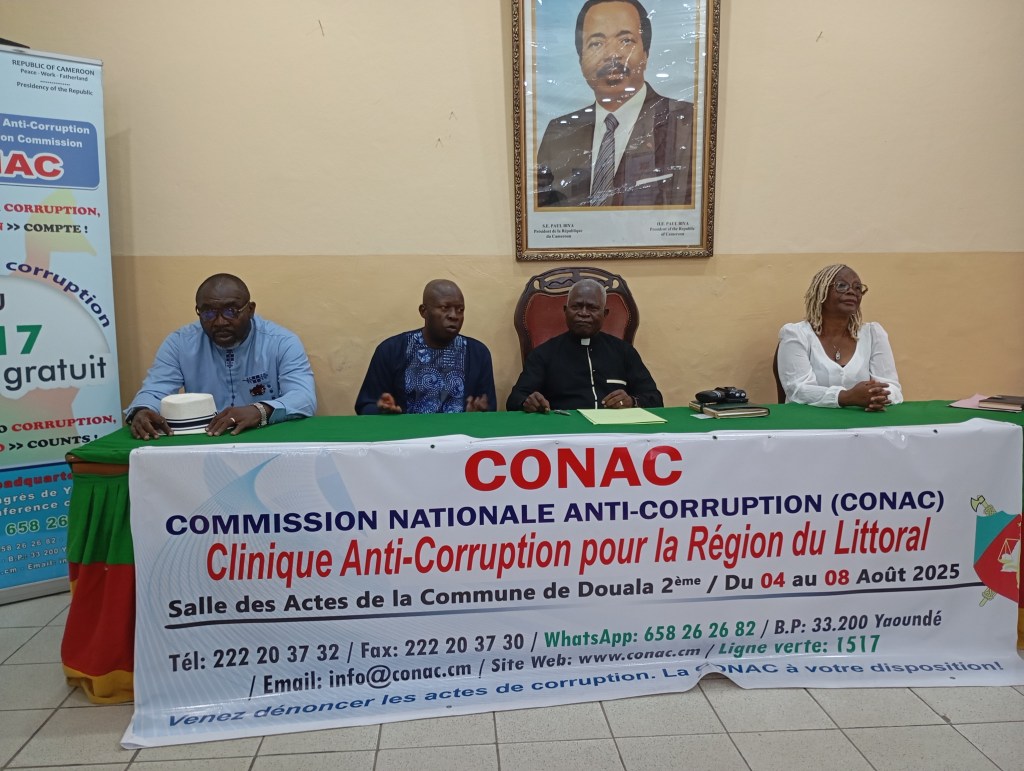 During a press conference on August 4, CONAC Chairman Rev. Dr. Dieudonné Massi Gams emphasized that their presence in Douala is timely, especially as schools resume in a few weeks, a period often marked by heightened corruption in government secondary and high schools. He reiterated that the Anti-Corruption Clinic is part of CONAC’s strategy to bring its services closer to the people, facilitating direct citizen engagement. It establishes a local platform where corruption cases can be reported and addressed immediately.The Anti-Corruption Clinic operates under Article 3, paragraphs 1 and 2 of the decree governing the establishment, organization, and functioning of CONAC, which states: “The Commission may initiate proceedings for any practices, deeds, and facts and similar offenses of which it is aware. Any natural or corporate body may also lodge complaints or denunciations regarding corrupt deeds and facts.” To meet these requirements, CONAC has implemented communication channels accessible to Cameroonians, including a public utility number (1517), a website (www.conac.cm), an email address (info@conac.cm) with a dedicated window for denunciation, and a WhatsApp number (658 26 26 82).Rev. Dr. Dieudonné Massi Gams informed the press in Douala that previous Anti-Corruption Clinics held in various regions, including Littoral, have resulted in significant sums being returned to state coffers, while some corrupt officials have faced legal consequences.It is important to note that the relocated CONAC services, supported by Judicial Police Officers designated by the Attorney General, are available to the population of the Littoral region to review and address reported corruption cases. “Each and every one of us, in our daily activities, must heed the call of the President of the Republic, made on December 31, 2023: ‘The fight against corruption will be intensified,’” remarked the CONAC Chairman.From August 4 to 8, 2025, all reported cases of corruption or related offenses will be thoroughly examined and investigated, with alleged perpetrators referred to court if necessary, as the competent authority for the enforcement of social justice.