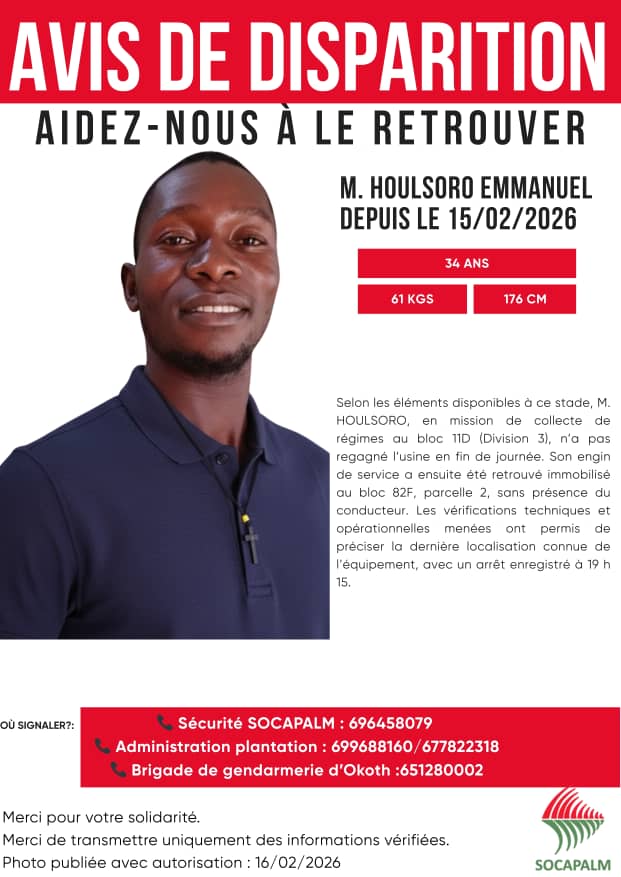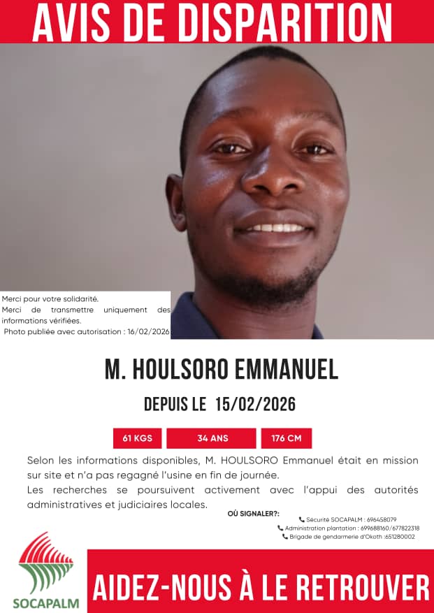 SOCAPALM General Management has issued an urgent appeal for information following the disappearance of Mr. Emmanuel Houlsoro, a tractor driver at the Edea plantation. Mr. Houlsoro was reported missing on Sunday, February 15, 2026, after failing to return from a routine assignment.Meanwhile,Mr. Houlsoro was last seen during a bunch collection mission in Block 11D (Division 3). Concerns were raised when he did not return to the factory at the end of his shift.